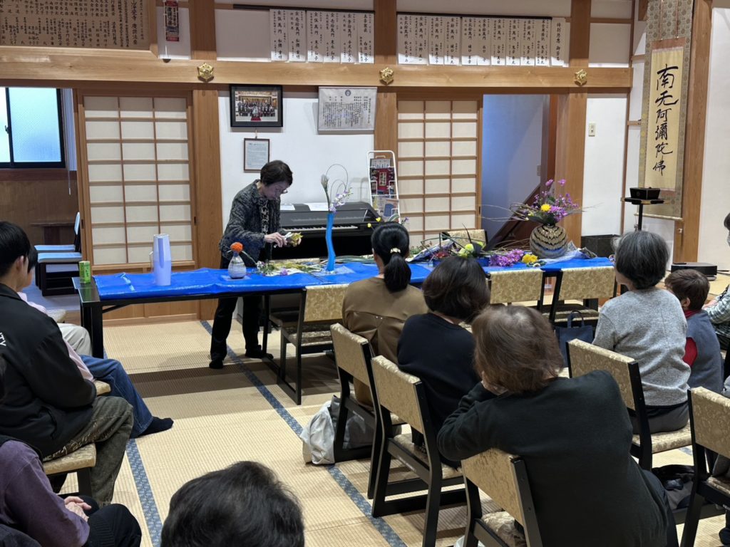 今回は、先生の生け花教室に通われている若い生徒さんもお参りくださり、お寺での勤行や法話にふれる貴重な時間を過ごされました。仏法に触れる新たなご縁となったように感じました。